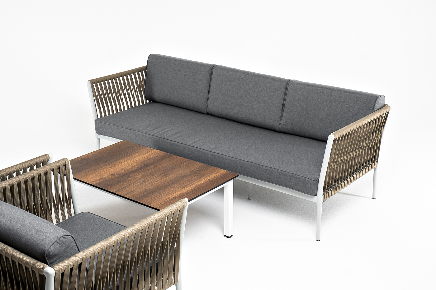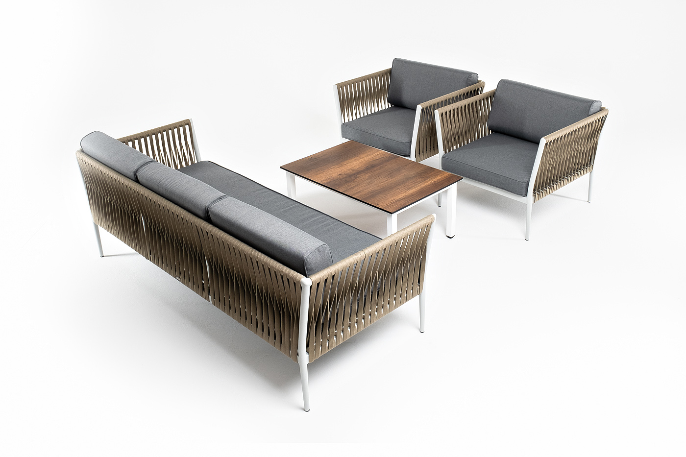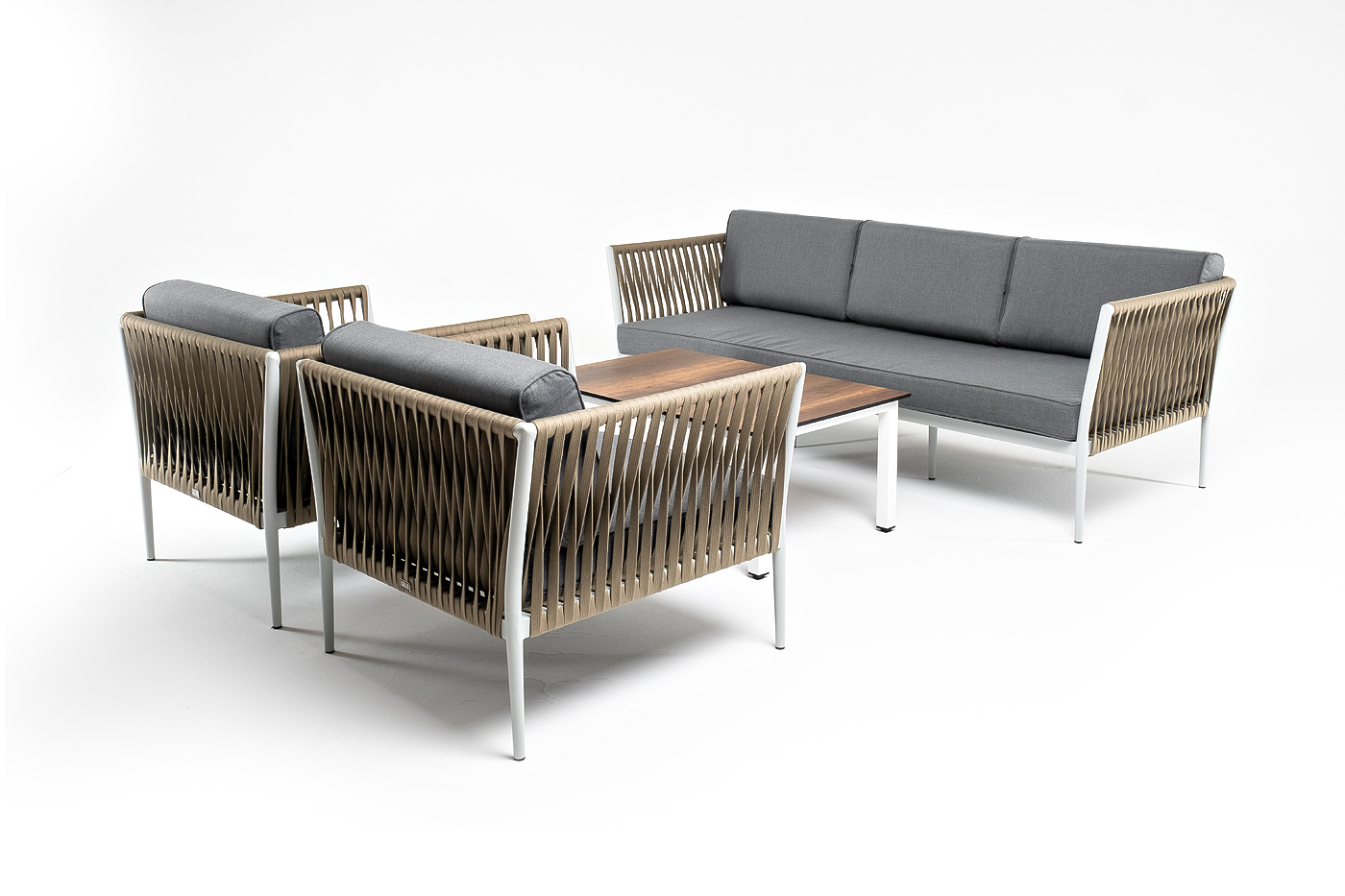 Диван и кресла изготовлены их алюминиевого прочного каркаса, оплетенного ручным способом роупом серо-коричневого цвета. Это эластичные ленты из полиэфирных волокон высокого качества.