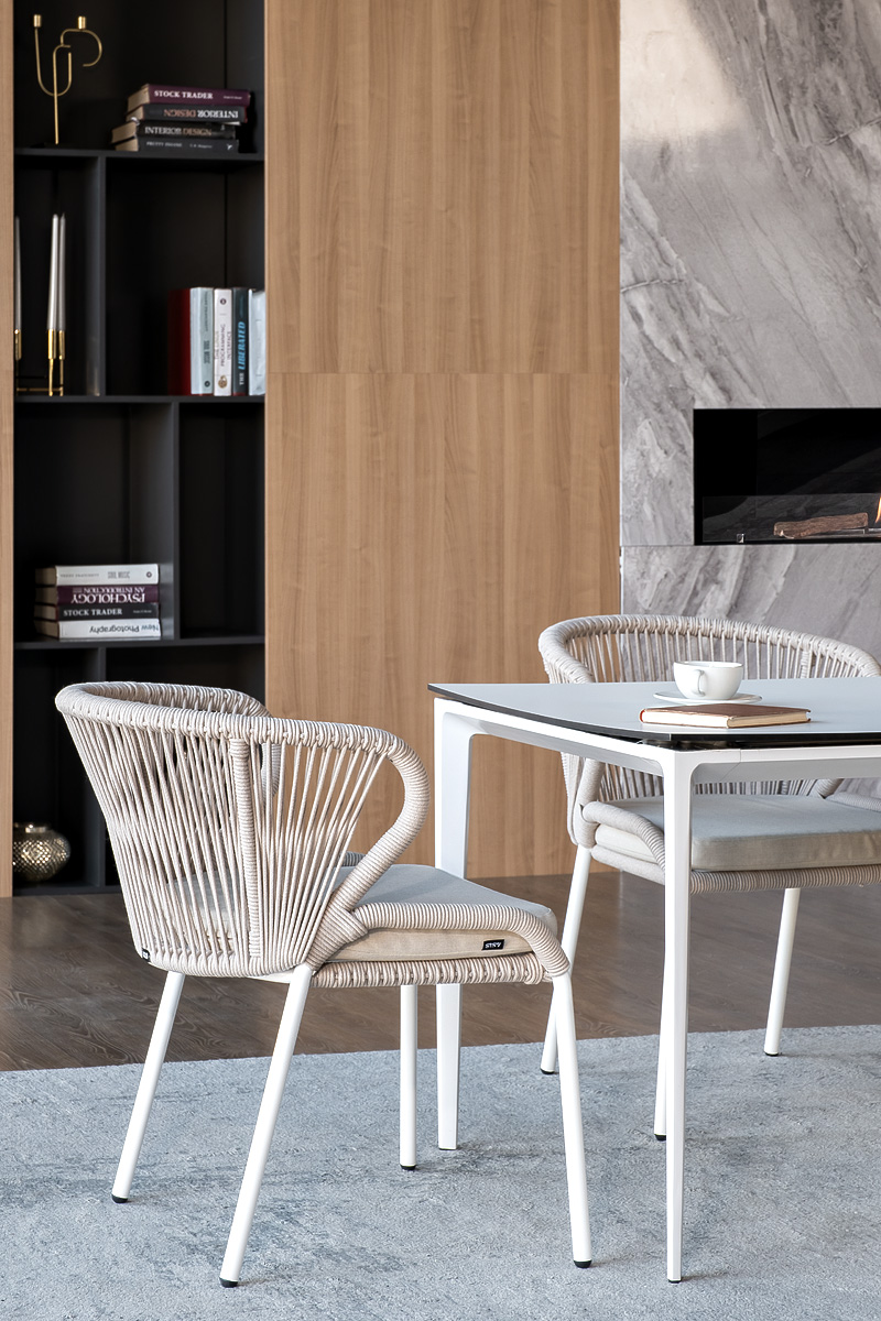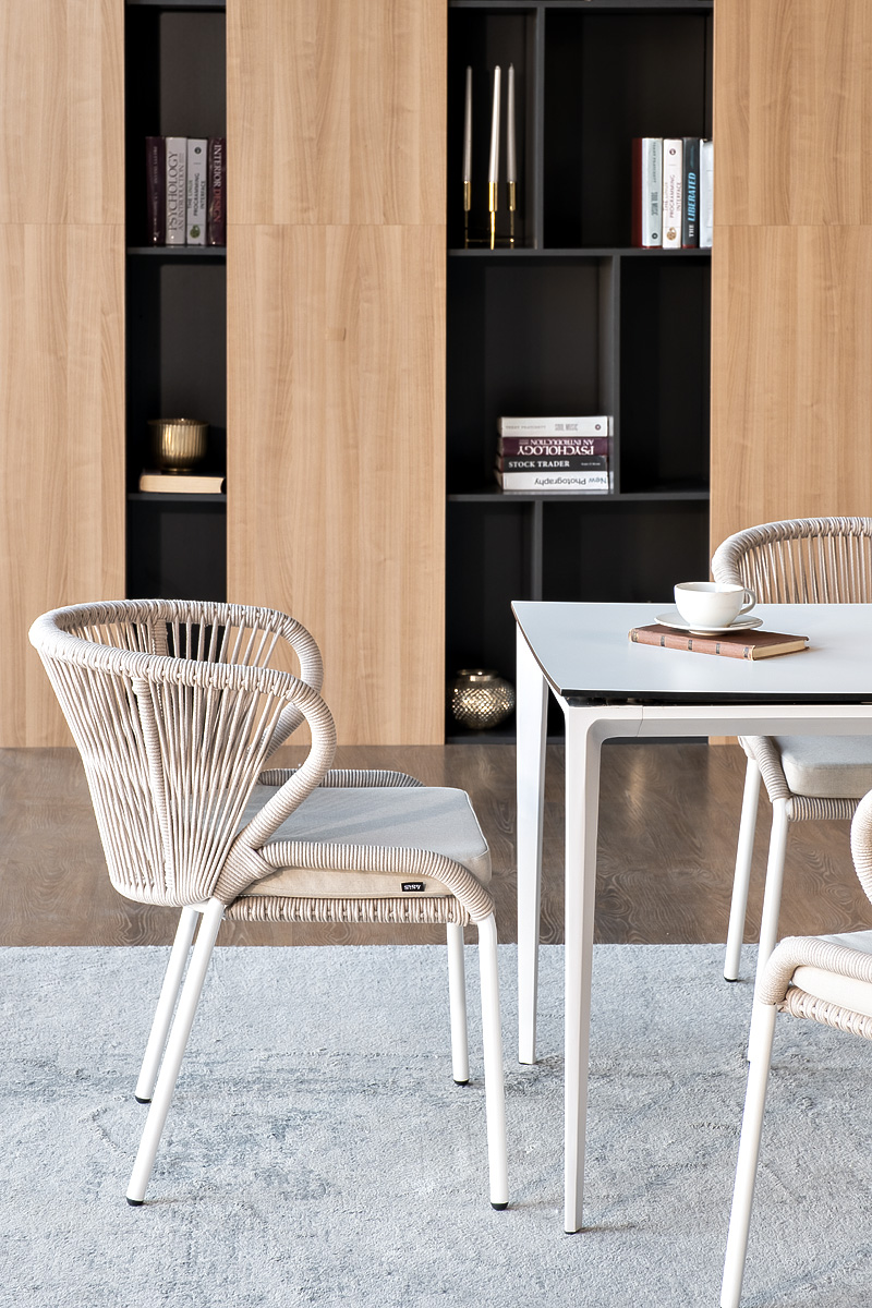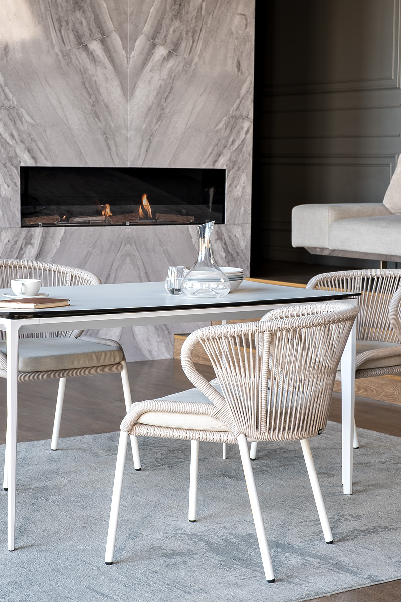В этот комплект входит стол с прочной и стильной столешницей из HPL-пластика размером 1400×800 мм и высотой 75 см (цвет столешницы - молочный), а также 4 плетеных стула «Милан», изготовленных из бежевого роупа с белым алюминиевым каркасом.