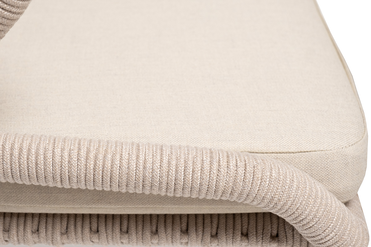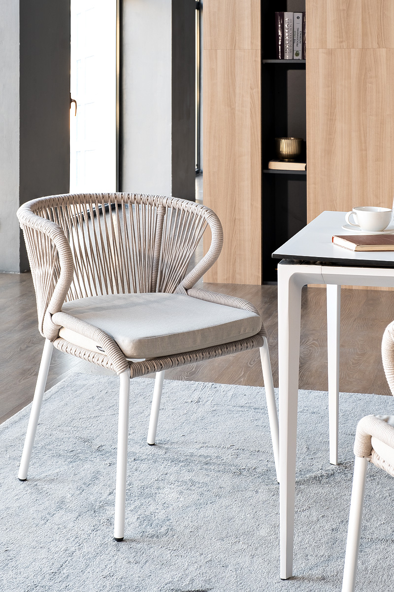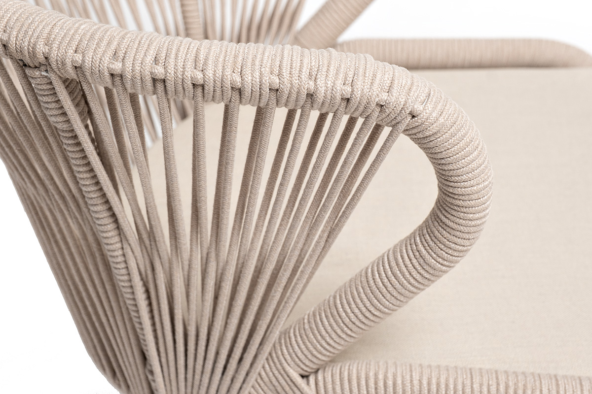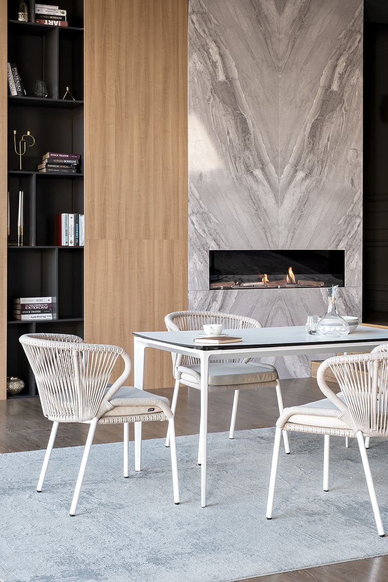 В этот комплект входит стол с прочной и стильной столешницей из HPL-пластика размером 1400×800 мм и высотой 75 см (цвет столешницы - молочный), а также 4 плетеных стула «Милан», изготовленных из бежевого роупа с белым алюминиевым каркасом.