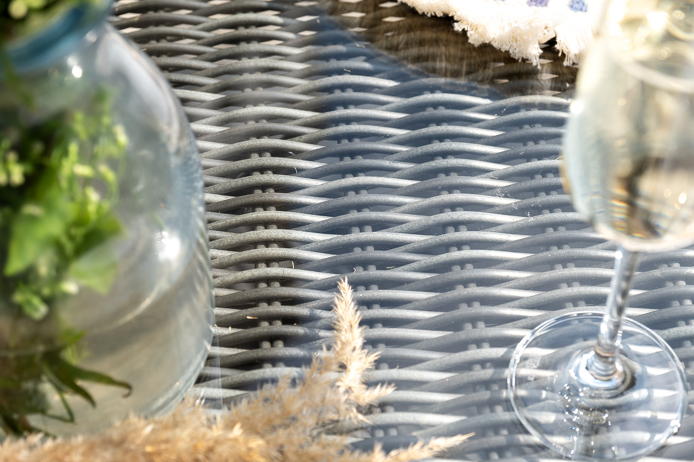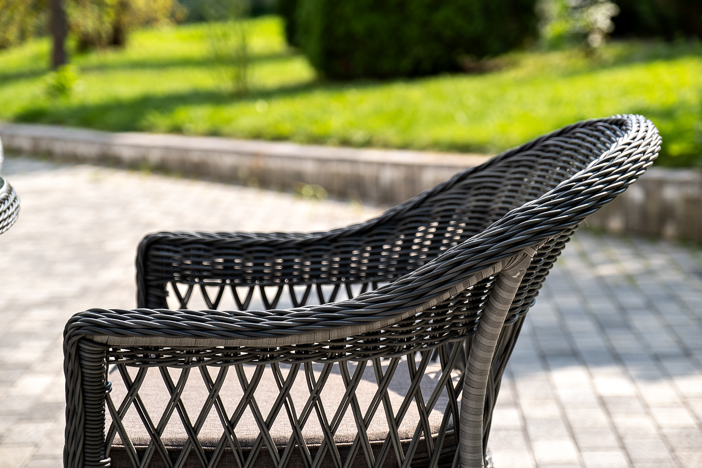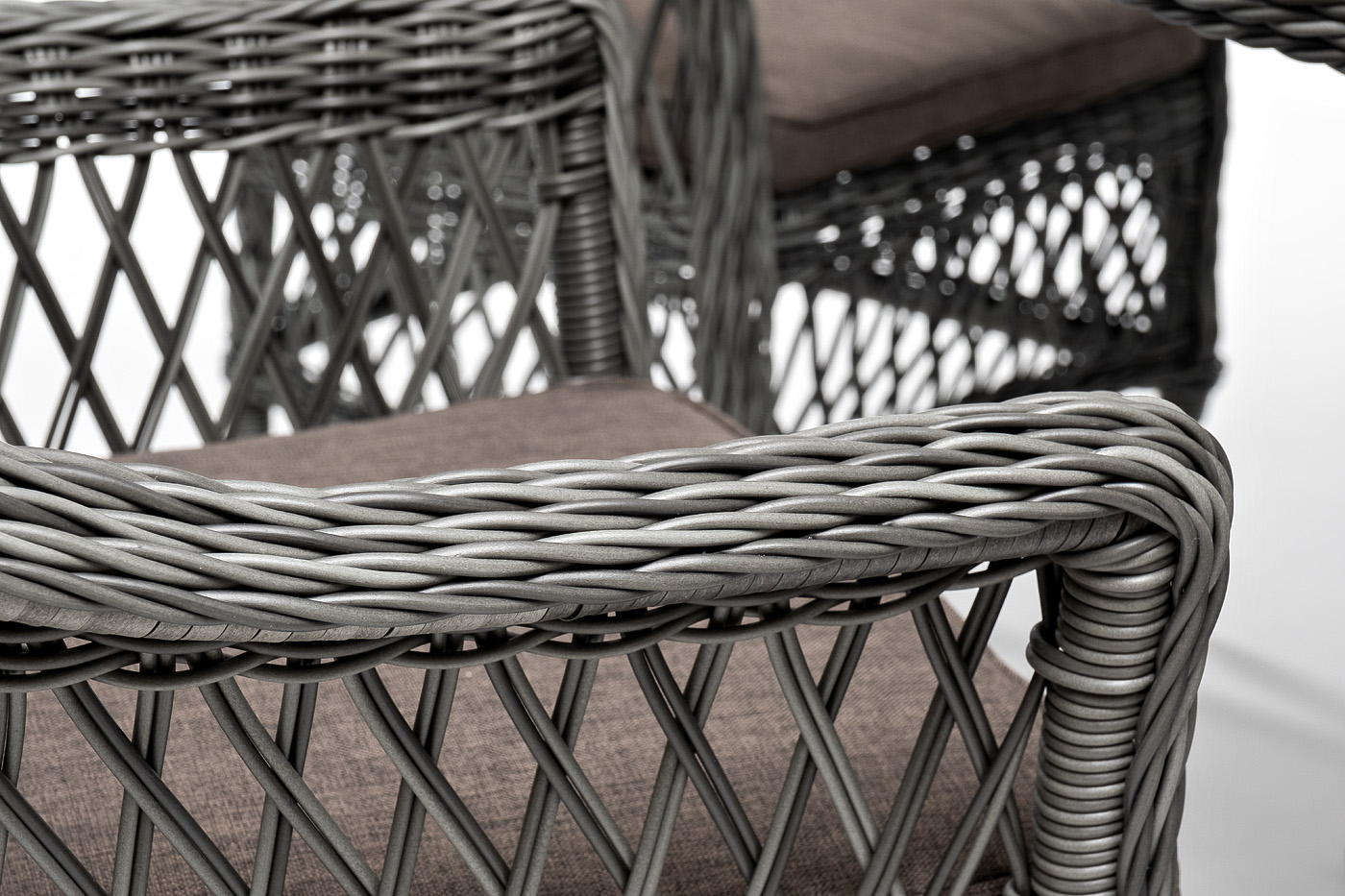 Вся мебель изготовлена из алюминия, поэтому ее очень легко перемещать. Декоративное покрытие выполнено из долговечного искусственного ротанга, устойчивого к перепадам температур и переменам погоды. Столешница изготовлена из прочного закаленного стекла 5 мм, кресла укомплектованы подушками серо-коричневого цвета со съёмными чехлами.